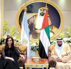 Era la primera vez que un presidente argentino visitaba esta ciudad y el debut fue fructífero. Los encuentros que mantuvo ayer la presidenta Cristina Fernández de Kirchner con su par de Emiratos Arabes Unidos (EAU), el jeque Khalifa bin Zayed al Nahyan, y más temprano con el príncipe heredero, el jeque Mohammed bin Zayed al Nahyan, permitieron cerrar formalmente acuerdos en los que la diplomacia argentina venía trabajando hace varios meses. Tras sendas reuniones, se formalizaron dos convenios de cooperación en materia alimentaria –que implican la apertura del mercado emiratí para productos no tradicionales– y sobre uso de energía nuclear con fines pacíficos. Los memorandos firmados incluyen la instalación de una oficina comercial en Abu Dhabi, que servirá de conexión para exportar a otros destinos de la zona. En tanto, el titular del fondo soberano Abu Dhabi Investment Authority (ADIA), el sheik Hamed bin Zayed al Nahyan, que maneja unos 627.000 millones de dólares en activos, confirmó que financiará obras de infraestructura en la Argentina, para lo cual se comenzó a coordinar una misión emiratí que arribará en los próximos meses al país.