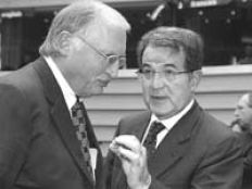 El presidente de la CE, Romano Prodi, dialoga con el encargado de la ampliación, Günter Verheugen.