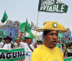 La compacta columna de manifestantes ingresó a Lima coreando “agua sí, oro no”. La consigna los había acompañado durante los nueve días que duró su marcha desde Cajamarca, unos 850 kilómetros al norte de la capital. La movilización –llamada Marcha por el Agua– organizada para protestar contra la explotación minera que agota el agua y contamina la que no consume, estaba formada mayoritariamente por campesinos, pero también había trabajadores de las ciudades, sindicalistas, jóvenes, representantes de organizaciones sociales y ambientalistas. La caravana se había iniciado a 4 mil metros de altura, en las lagunas andinas de Cajamarca, que el proyecto minero Conga, de la empresa Yanacocha, de capitales norteamericanos y peruanos, pretende secar para explotar oro.