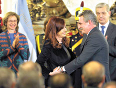 “Olé, olé, oleeé, oleeé, Chivooo, Chivoooo”, se escuchó desde temprano en el Salón Blanco de la Casa Rosada en el que se tomó el juramento a los nuevos ministros del gabinete nacional, Agustín Rossi y Arturo Puricelli. La jura de los ministros de Defensa y Seguridad generó entre el público una mezcla de militantes y personal de las Fuerzas Armadas y de seguridad que diez años atrás hubiera sido imposible imaginar. El más aclamado –después de la presidenta Cristina Kirchner– fue el ahora ex diputado Rossi, al que acompañaron diputados del bloque que condujo durante ocho años, legisladores santafesinos y un nutrido grupo de jóvenes.