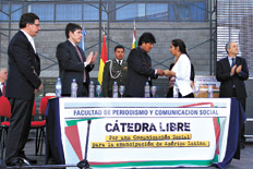La anécdota inicial, y sobre todo su final, fue la moraleja inaugural de la cátedra, cuyo programa se abrió con la conferencia magistral de Morales: “Decidimos que teníamos que comprar una radio –definió el presidente–. Aportamos cinco bolivianos por afiliado, conseguimos el dinero, pero no nos dieron el permiso. Comenzamos igual, de manera clandestina, y entonces la radio de los Estados Unidos ya no tuvo ninguna audiencia”. Radio Soberanía es hoy una de las tantas que conforman la red de radios comunitarias a lo largo de toda Bolivia y cumple, al igual que el resto, con las funciones que según Morales rigen a todo medio de comunicación: “Educar e informar, pero también decir la verdad y contribuir a la liberación de los pueblos”, concluyó.