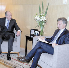 El presidente electo Mauricio Macri tuvo ayer su primer contacto con uno de los visitantes internacionales que llegaron para su asunción al reunirse con el rey emérito de España, Juan Carlos de Borbón. En su último día como jefe de Gobierno, Macri recibió a Juan Carlos en la sede de gobierno porteña en Parque Patricios. Hoy volverán a encontrarse pasadas las 14, cuando está previsto el saludo del ya flamante presidente con los representantes extranjeros en el Palacio San Martín, y posiblemente algunos encuentros bilaterales.