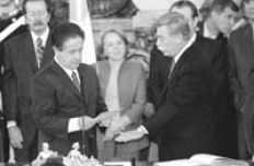 El presidente Eduardo Duhalde le toma juramento al secretario de Inteligencia, Carlos Soria.