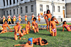 Afuera del Parlamento, pese a los nueve grados de temperatura, integrantes del grupo Mujeres y Salud en Uruguay (MySU) protestaron desnudas y pintadas de naranja. Pidieron que se legalice el aborto.