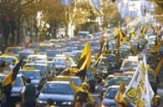 Alrededor de un millar de taxis tapizaron de negro y amarillo, primero, el carril sur-norte de la 9 de Julio desde el Ministerio de Salud y Acción Social, y luego –avanzando a contramano– la Avenida de Mayo hasta terminar frente a la sede del gobierno porteño. Fue ayer, cerca del mediodía. La movilización, que generó un caos de tránsito, fue convocada por el Sindicato de Peones de Taxi, encabezado por Oscar Viviani –quien la semana pasada expresó su apoyo al candidato Mauricio Macri–, para reclamarle a Aníbal Ibarra más seguridad para los tacheros, luego de que fue asesinado hace dos semanas un conductor a manos de delincuentes y el lunes último otro fue herido durante un robo.
