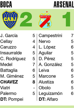 Más allá de Palermo y de la gente, las claves del partido fueron la buena actuación de Cristian Chávez y la entrada en escena del pibe Sergio Ezequiel Araujo, quien reemplazó al lesionado Viatri y en la primera jugada en la que consiguió un poquito de espacio quebró la cintura a lo Rojitas, desparramó a media defensa de Arsenal, se acomodó y, cuando la vio bien, metió el derechazo violento que no le dejó ninguna chance a Campestrini.