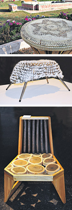 Y el banco Cumpa, de otro tucumano, Román Maximiliano Sánchez, que lo presenta en primera persona: “Me llamo Cumpa, soy del Norte, llevo en mis venas sangre tucumana y santiagueña, mis padres me llamaron así porque represento la amistad y el compañerismo, me gusta estar siempre rodeado de amigos y escuchar anécdotas gauchescas alrededor del fogón. Mi pie está hecho de nogal, fuerte y firme como la madre tierra, y mi cuerpo está realizado en finos listones de palo amarillo representando a las hojas de la planta paja brava, como es llamada en Santiago, tengo el pelo hecho con las fibra de esa planta y pequeños toques de palma y unquillo, enrollado en 40 cm de forma circular, bien ordenado porque me gusta estar presentable, pero uso algunos mechones de colores que puedo teñir y variar cuando quiero para estar siempre a la moda. Soy pequeño y livianito, así me pueden transportar adonde quieran sin ninguna dificultad, mido 40 cm de altura y tengo una base de 30 cm de diámetro, puedo estar en cualquier espacio de la casa, ya que me llevo muy bien con el entorno y soy muy sociable. Tengo esta formita cónica porque así es como crece la planta que represento en mis pagos norteños”.