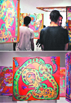 S. M.: –Este modo que tenemos de dibujar y de trabajar te va llevando, vas descubriendo, leés el inconsciente del otro, y esa animalización de lo humano es un poco lo que nace acá. Despertamos ese tercer ser que lo llamamos Hombre Lobo. Y que por ahora son estos cuadros de la muestra y pañuelos y blusas. Vamos a seguir con camisas, remeras y camperas.