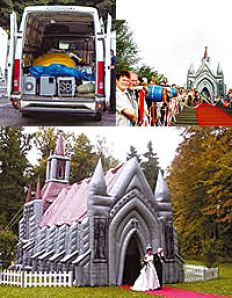 Para aquellos que tienen creencias flexibles, la empresa Innovations Extreme (www.innovationsextreme.com) fabrica iglesias inflables de diversos tamaños y estilos arquitectónicos. También sirven para casarse de apuro y de blanco donde sea. Parecen “de usar y tirar”, pero tienen sus detalles: su falso altar, falso órgano y falsos vitraux, y angelitos flotantes. Se puede armar en dos horas y desarmar en mucho menos.