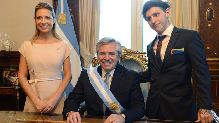 En su primera foto en el sillón presidencial, Alberto Fernández estuvo acompañado por su pareja, la Primera Dama Fabiola Yañez y su hijo Estanislao, que destacó que parte del