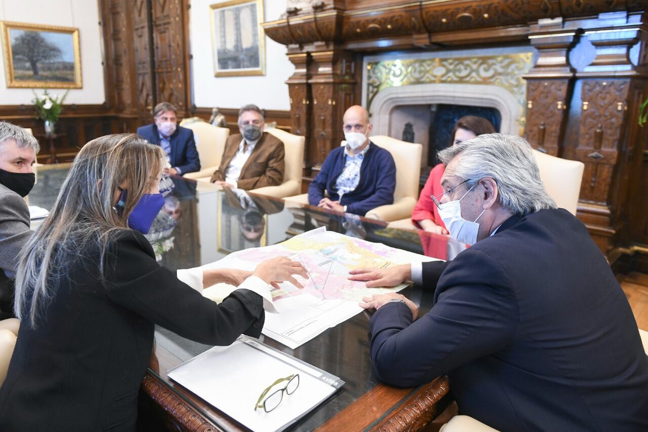 El Presidente estuvo acompañado por intendentas de todas las regiones del país. Además, estuvieron la ministra de Mujeres, Género y Diversidad, Elizabeth Gomez Alcorta y su par de Obras Públicas, Gabriel Katopodis, además de la titular de AySA, Malena Galmarini.