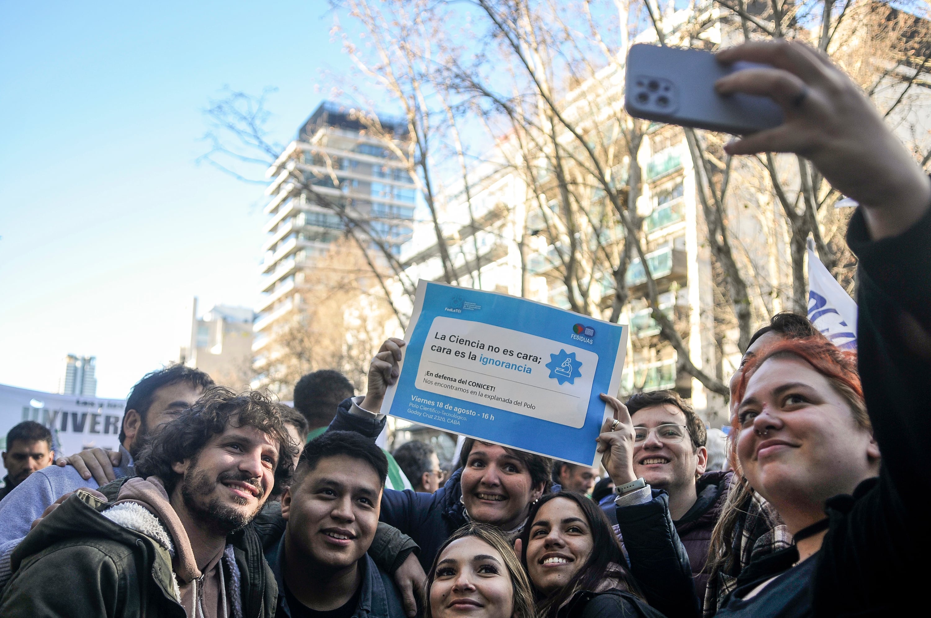 Como en el macrismo, la explanada del Ministerio de Ciencia volvió a ser escenario de una convocante protesta, esta vez, contra el llamado explícito a terminar con los organismos del área.