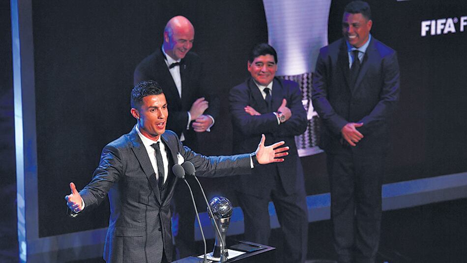 Tras un 2017 en el que ganó la Champions League, la Liga española, la Supercopa de Europa y la Supercopa de España, el portugués se impuso en la votación a Messi y Neymar y se quedó por segundo año consecutivo con el trofeo al mejor jugador del año. Maradona, junto al brasileño Ronaldo, le entregaron el premio en Londres.