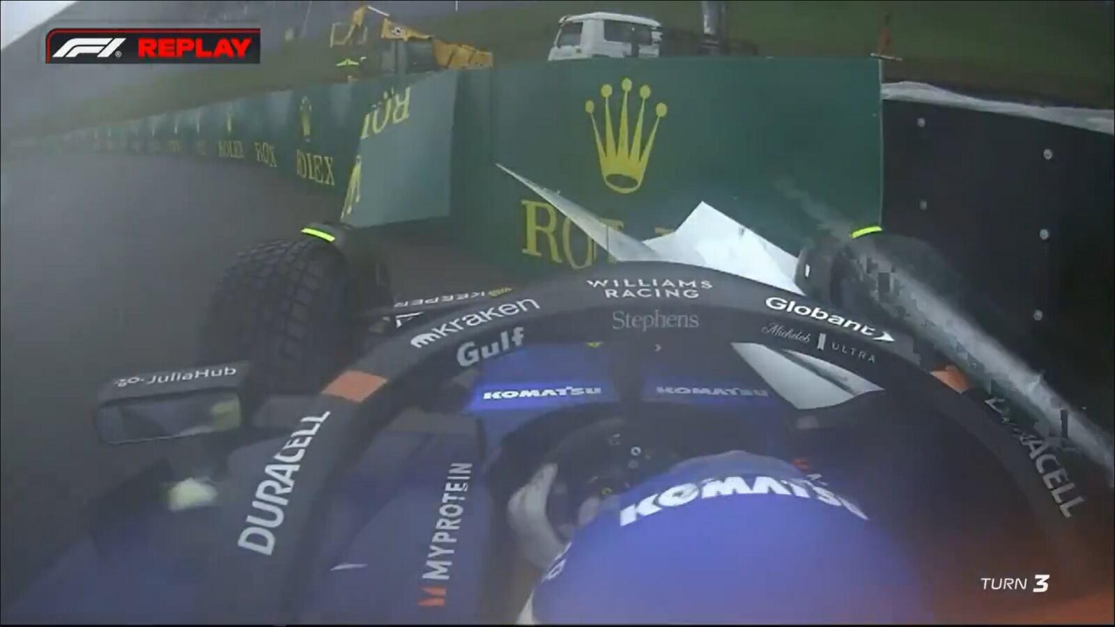 El piloto argentino chocó contra uno de los paredones, cuando caía un diluvio sobre el circuito.