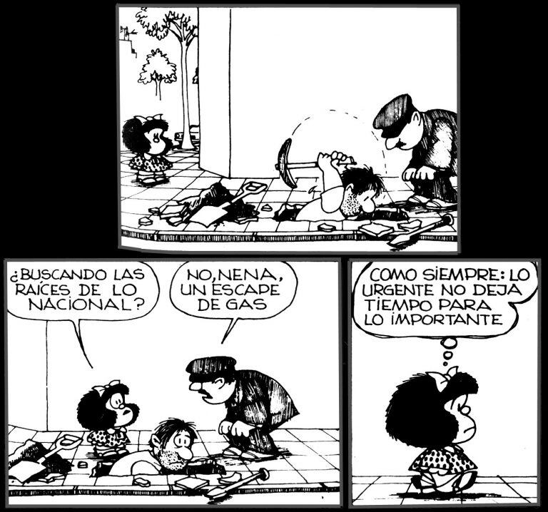 Todavía, en mi casa, frente al lugar en donde trabajo conservo dos tiritas de Mafalda. “Uno manda un padre a la mañana a la oficina y le devuelven esto”, dice .