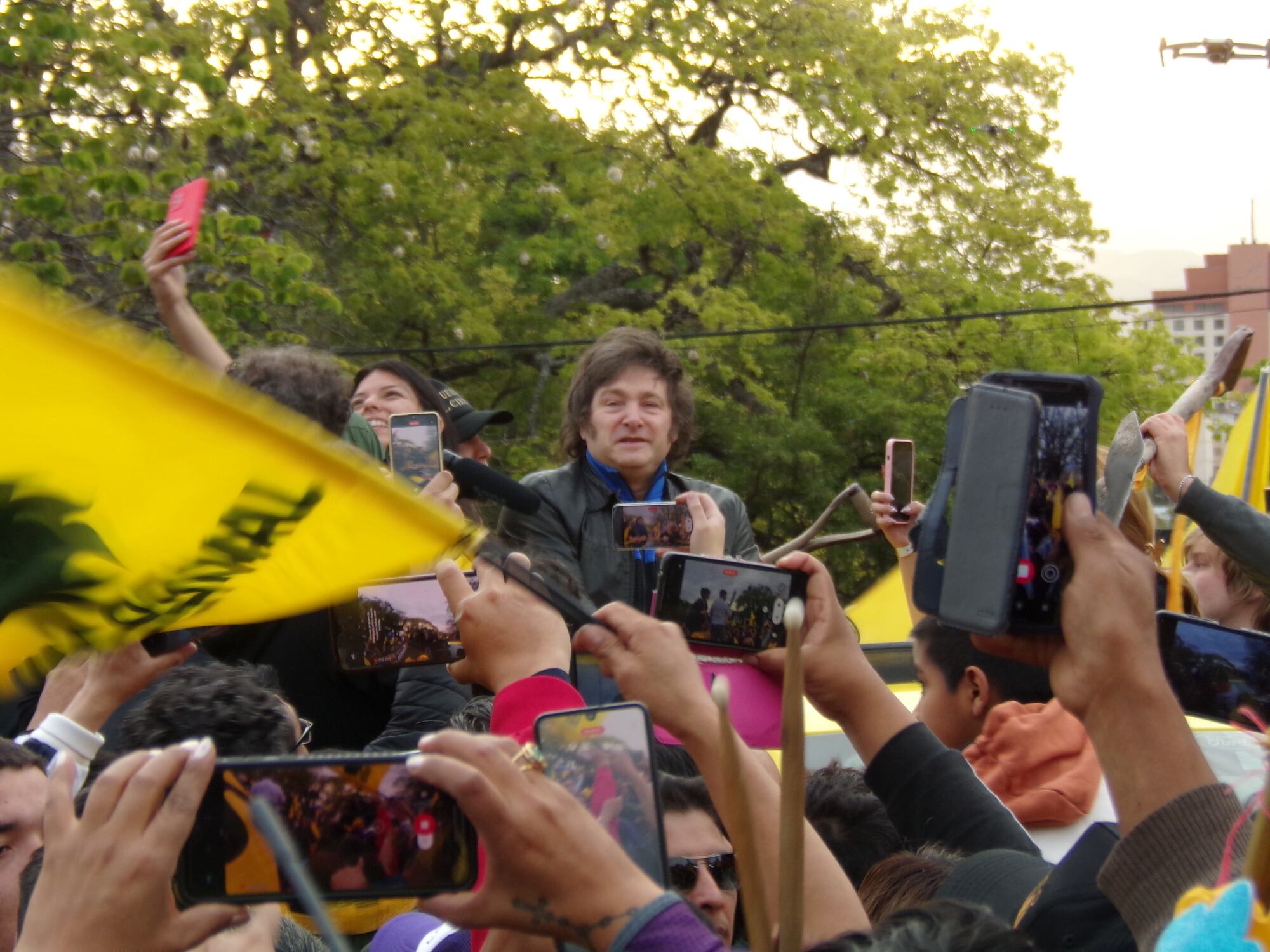No brindó declaraciones a la prensa, y dejó a las y los libertarios con el sabor amargo de no haberlo escuchado personalmente. Asomó al balcón del hotel donde se alojó, saludó cual Perón a sus seguidores, y tiró copias de dólares que generaron una pequeña corrida.
