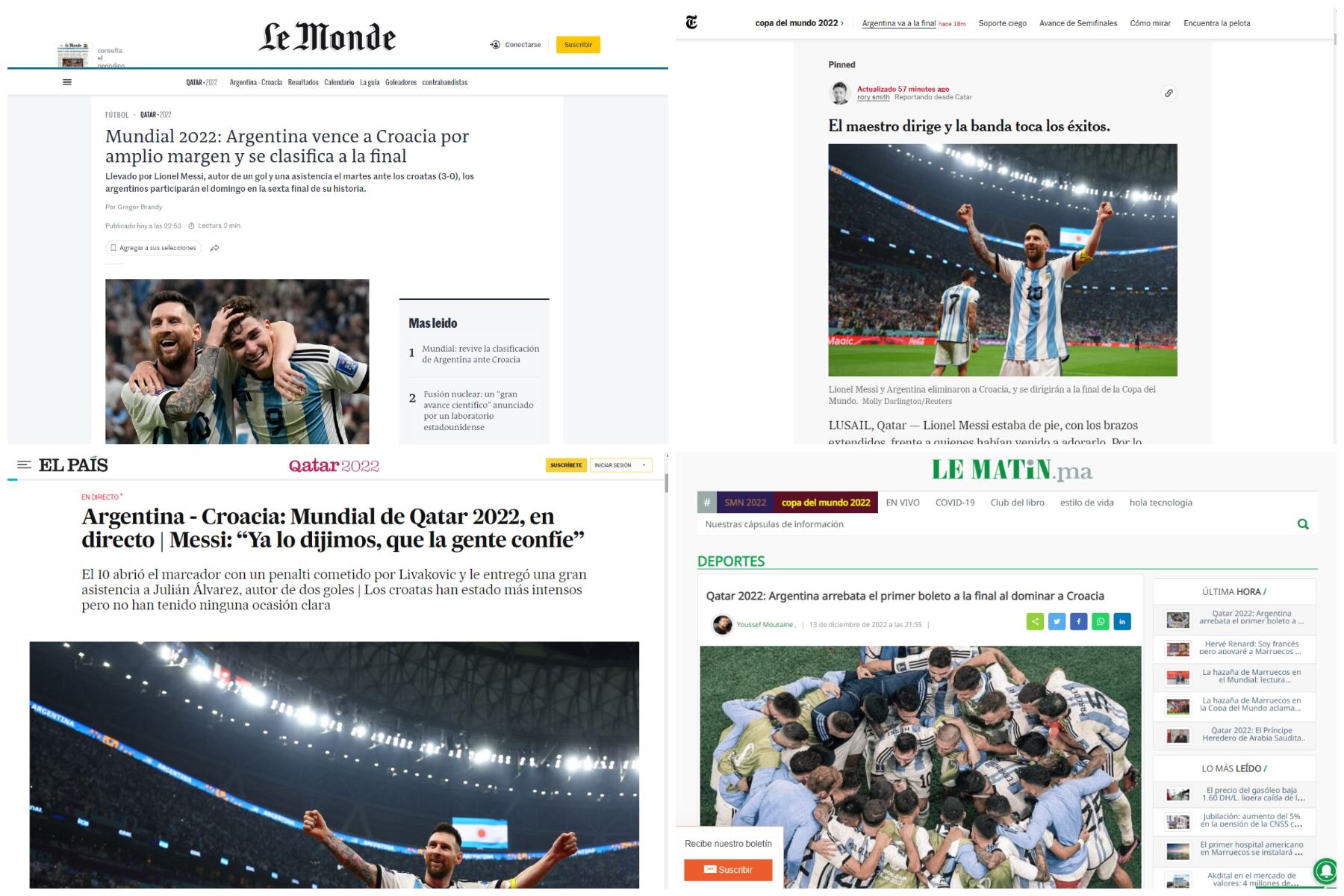La selección nacional consiguió la clasificación a la final del Mundial de Qatar 2022, tras vencer a Croacia por 3 a 0. "El maestro dirige y la banda toca los éxitos", destacaron sobre Messi en The New York Times.