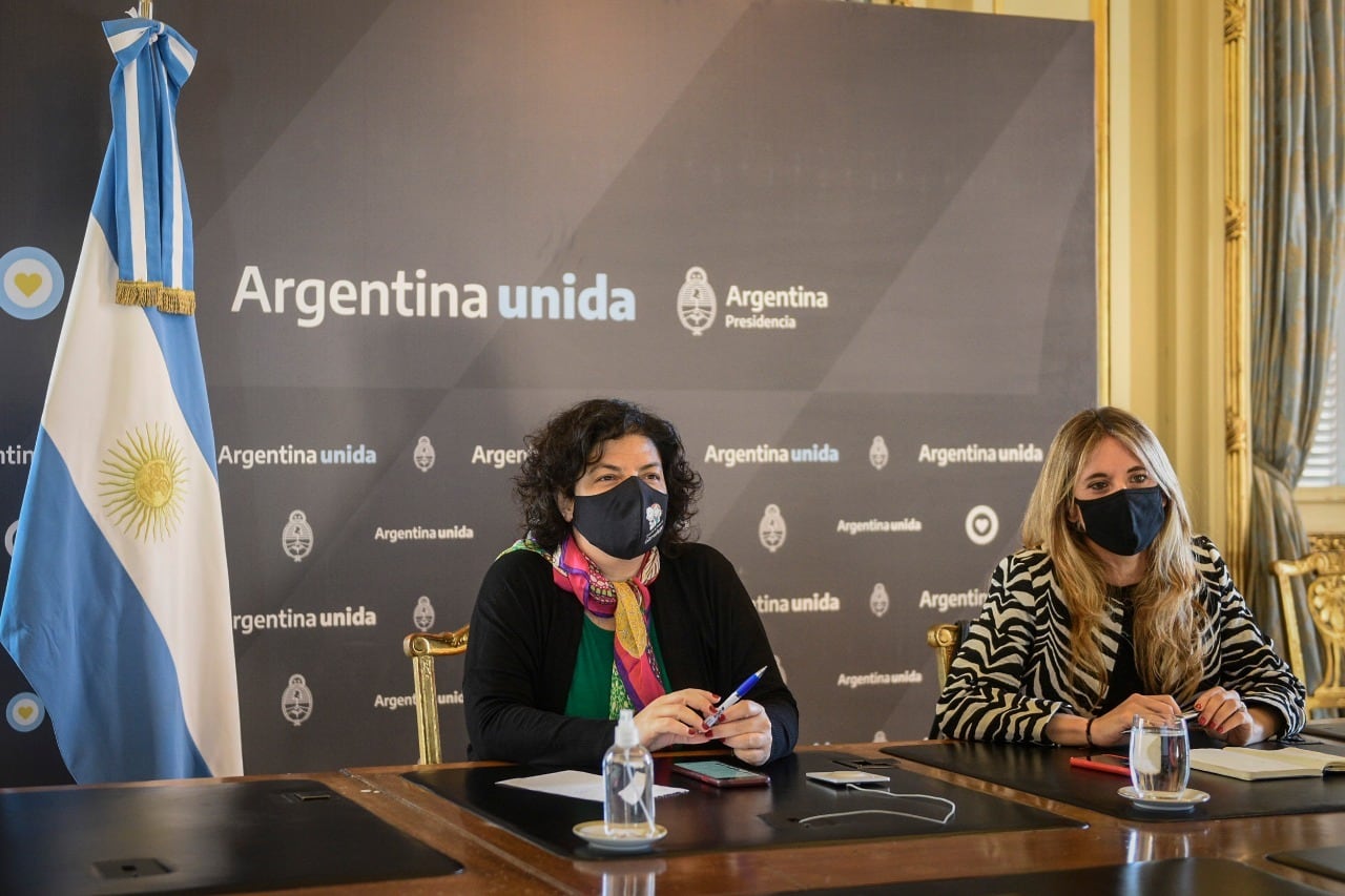 La ministra de Salud, Carla Vizzotti y la asesora presidencial, Cecilia Nicolini, se r